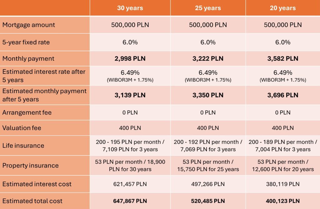 Let’s say you buy a regular apartment (not energy-efficient) for 700,000 PLN and put down 200,000 PLN. That leaves you with a 500,000 PLN loan at a 6.0% fixed rate for the first 5 years.